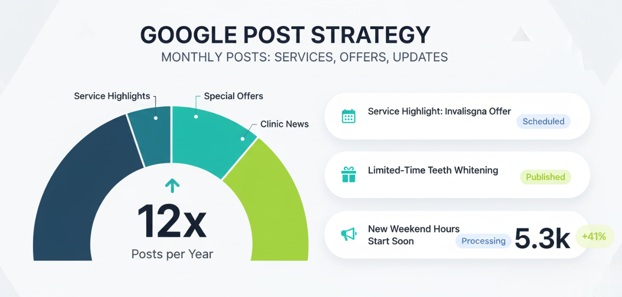 Google favours clinics with accurate, complete info, strong reviews, and fresh posts.