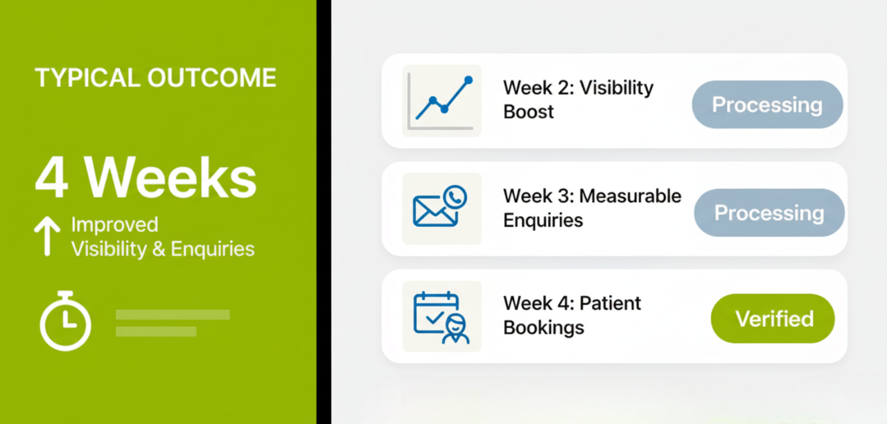 Improved visibility and measurable enquiries often within 2–4 weeks.